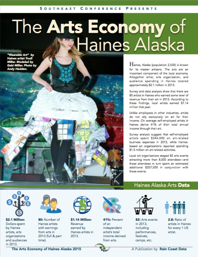 The study summarizes arts employment and wage data in Haines Alaska. It also presents the findings of The Economic Impact of Arts in Southeast Alaska Survey (prepared for Southeast Conference) which was taken by 60 artists and art organizations in Haines.The study found that the strong Haines arts sector is an economic asset that stimulates business activity.